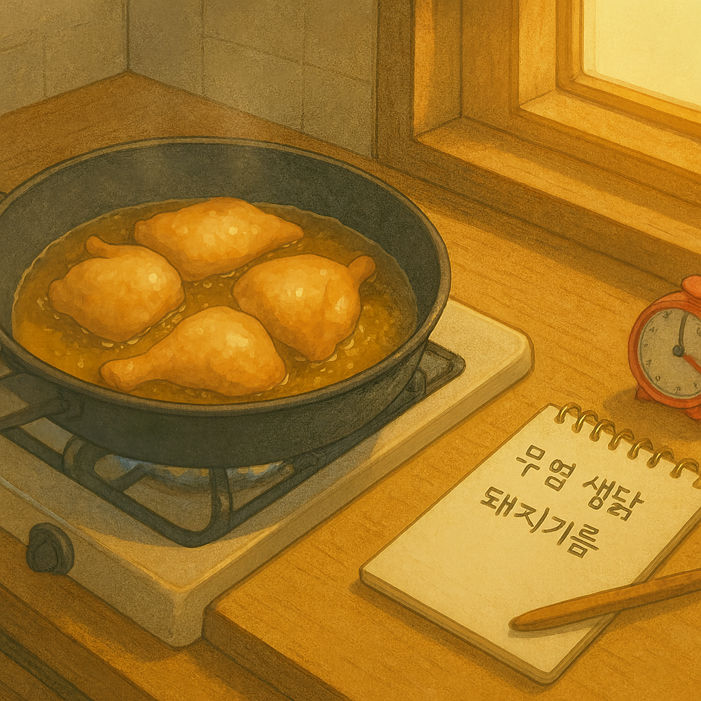 무염 생닭을 돼지기름에 천천히 익히는 깊은 팬의 모습. 기름에 고기가 잠기지 않고, 조용히 표면만 익어가는 중. 불 세기는 약하고, 옆에 메모장과 타이머가 놓여 있음.