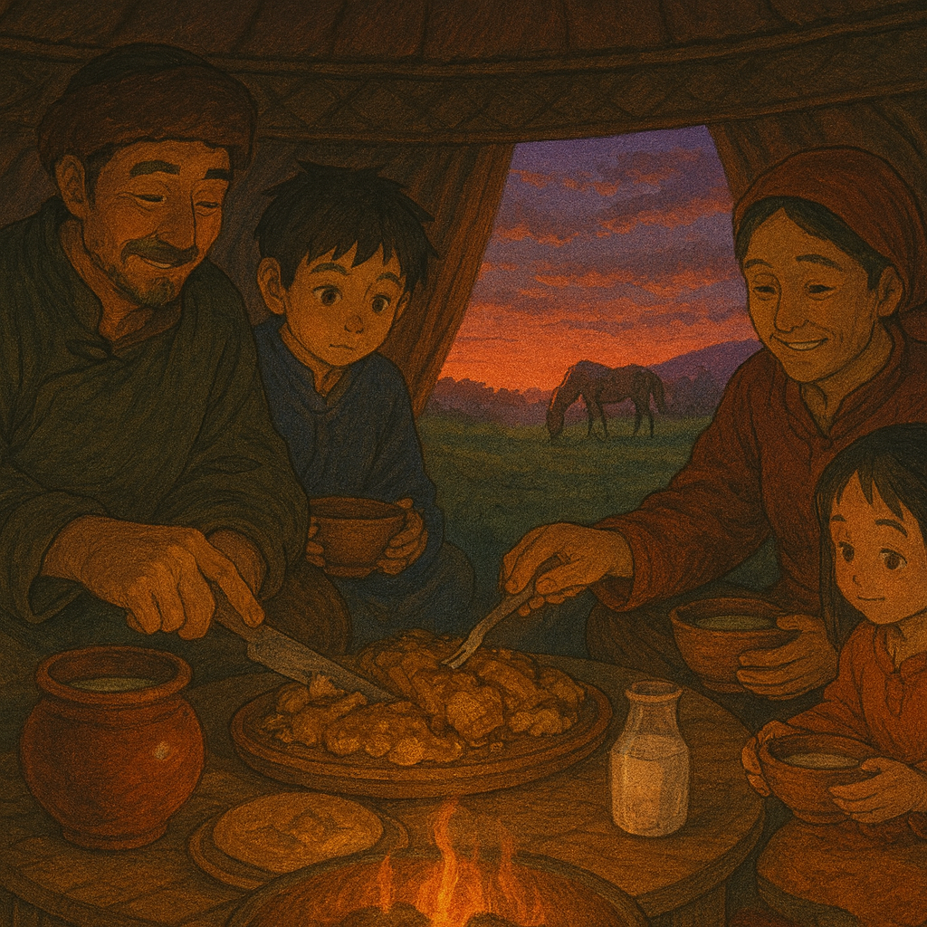 황혼 무렵, 들불 앞에 고기를 나눠 먹는 유목민 가족. 배경엔 붉은 하늘과 말이 천천히 걷고 있는 따뜻한 장면.